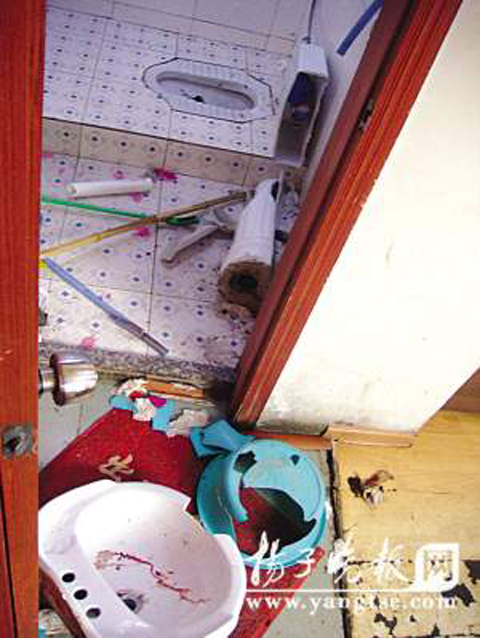 昨天上午,記者來到案發飯店,出現在記者面前的場景宛如一個兇殺現場:一樓樓梯口仍留有大片血跡,和黑色橡皮筋一起被扯下的頭發、砸穿的廣告牌和斷裂的椅子、斷臂的招財貓亂七八糟散落一地,廁所里的洗手池支架被連根拔起又倒在地上,斷裂的拖把和浸染了鮮血的洗手池已被拋到廁所外……所有這一切,都清楚地表明案發當晚,這里曾發生了激烈的搏斗。
