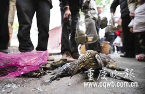“下一場,我要3只貓頭鷹和40只斑鳩。”一個開川籍車牌皮卡車的男子,交代一個接錢數得正歡的老翁。“要得,你提前一天打電話,絕不讓你跑空路。”老翁趕忙承諾,預訂“貨新鮮,品種多”。