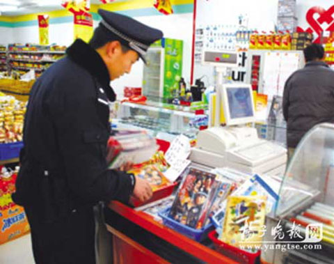 記者在現場做了錄像取證,隨即撥打110報警。很快,建鄴區警方來到現場,對所有光碟進行了檢查。很快查出近40部全部帶有挑逗性字眼的光碟。隨后,民警沒收了這些光碟,并將超市當天值班的負責人帶走調查。“看著碟片宣傳內容就知道是色情碟片了,但我們也沒辦法,是被脅迫賣的,警察這么一查,我整個人也輕松多了,超市也解脫了。”超市負責人朱先生說,超市賣黃碟實在是無奈之舉,前不久,一群陌生人抱來這些碟片,陌生人個個都流里流氣的,說話也很兇。陌生人說讓超市代賣碟片,朱先生當時也查閱了碟片,見里面夾著不少黃色光碟,當即就拒絕了來者。“你超市不想開了是不是?我們每天帶一幫人來砸店鬧事你信不?”朱先生聽了這些恐嚇之言,當即害怕了。他籌資幾十萬好不容易開了個超市,不想引麻煩上身,便默默接受了這單不賺錢的生意。朱先生還告訴記者,自從超市被迫賣黃色光碟后,時常遭到一些熟客的白眼,熟客都認為超市不正規,就很少來光顧了,生意也不如從前火了,但一直怕陌生人前來鬧事,只好將苦水往肚子里吞,繼續讓這些黃碟在超市銷售。