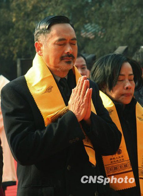 中國廣播網消息 一月二十二日,正值電影《孔子》在中國全國公映日,劇中孔子的飾演者著名表演藝術家周潤發及《孔子》劇組全體人員風塵仆仆趕到孔子故里——山東曲阜,在孔廟大成殿前舉行了莊重的祭拜孔子儀式。中新社發孔穎攝