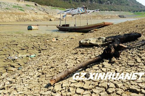 2010年2月23日,位于黔西南布依族苗族自治州的馬鈴口水庫已完全干枯見底,一艘木船擱淺在庫底。新華社記者 劉續 攝