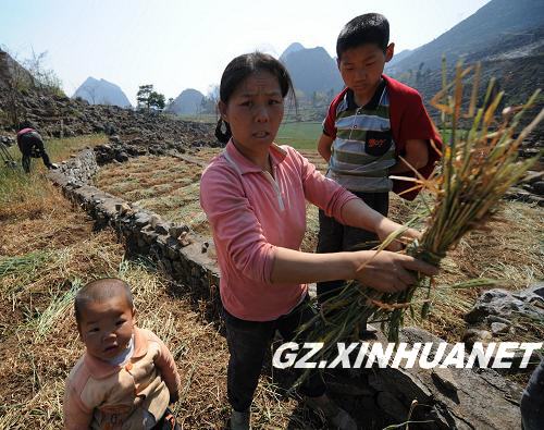 2010年2月23日,黔西南布依族苗族自治州敬南鎮攏岸村民正在收集干旱枯死的麥苗,準備拿去喂豬。新華社記者 劉續 攝