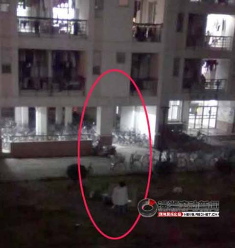 據照片顯示,當時為傍晚,路燈尚未開啟,遠處樓下燈光處有不少自行車,一位穿著白色上衣的男子雙腿跪向宿舍樓,旁邊即是宿舍的入口,二樓三樓有部分宿舍房間的燈是開啟的,窗臺上掛著尚未收進屋的衣服,并無其他人在現場。