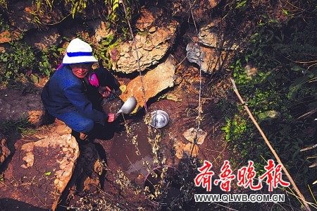 上午11時,村子一竹林底下的小水潭沁出了一些水,龔玉春讓兒媳婦趙紅英去舀回來,這是村里僅有的兩處活水之一,是全村172戶人家的生命之源,村民圍著沁水口用石頭壘成深井。一個上午,小水潭積了約4桶水,趙紅英幾瓢下去,勉強舀夠半桶清水,被攪起的泥漿已讓小水潭映不出她的倒影,但她還是繼續把桶舀滿。