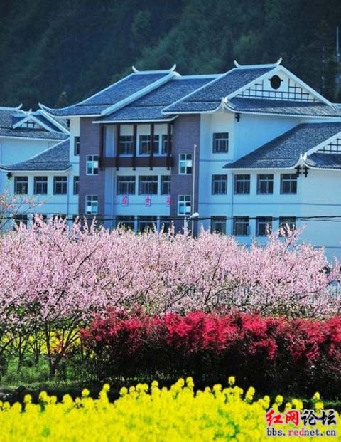 3月30日晚上,網友“捷安特候補”在張家界公眾論壇發表了篇題為《中國最牛鄉村學校》的帖子,附帶兩張照片。幾棟極具民族特色的房子,白墻黑瓦,依稀還能看到上面掛著有“小學部”、“綜合樓”等字樣,樓房看上去非常新,校舍旁邊還有盛開的油菜花、桃花、紫羅蘭等。