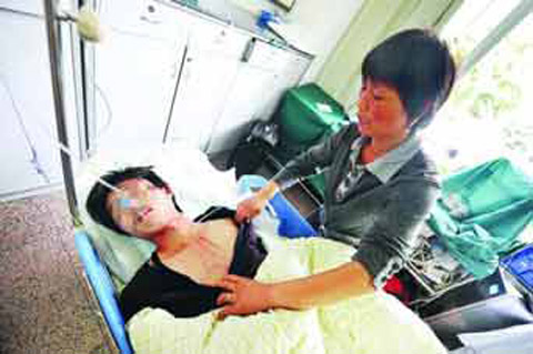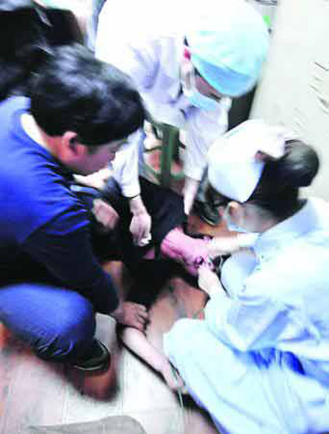 上午10時,福建醫大附一醫院的救護車駛到派出所門口。此時,于強正躺在二樓案審室地上,一名親友抬著他的頭。顯得有些不清醒的他不停抽搐,雙腳使勁蹬著,兩眼微閉,眼角有眼淚流出,嘴里吐出白沫。記者注意到,他的衣服前胸部分已被撕爛,胸前可見紅色的傷痕。警察說,他剛進派出所時還好好的,正做筆錄時突然抽搐,之前他曾說被人用腳踢上半身及腦部。