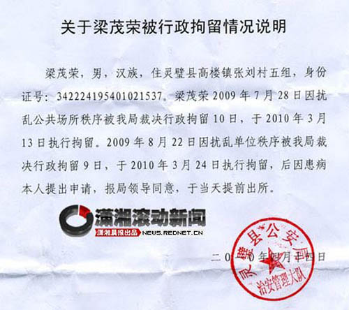 另外還有一張靈璧縣公安局治安管理大隊公章的說明提到,梁茂榮確實是依據去年的事,今年進行了拘留,并明確了執行時間,而同時提到當事人因患病提出申請,于3月24日將其釋放。