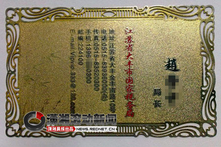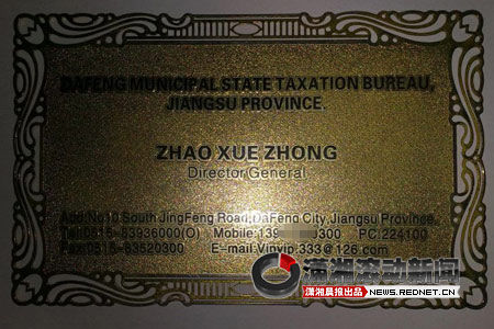 近日,有網(wǎng)站以《局長的名片就是牛B》為題,發(fā)帖曝光大豐市國稅局局長趙學(xué)中使用“黃金版”名片。對此,我局高度重視,立即采取三項措施:一是要求趙學(xué)中本人說明情況;二是調(diào)查該名片制作廠家,了解名片設(shè)計制作的材質(zhì)及價格情況;三是向當(dāng)?shù)丶o(jì)委等部門匯報,請求他們對該名片材質(zhì)進(jìn)行檢驗。經(jīng)過調(diào)查,情況如下:
