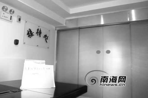27日下午,記者來(lái)到三亞市綜合執(zhí)法局辦公大樓。剛走出6樓電梯,就看到電梯門(mén)口前面擺放著一張辦公桌,墻上有“接待處”的提示牌。桌上放著一部電話,旁邊的臺(tái)歷上貼著一張紙條,上面寫(xiě)著:有事請(qǐng)到5樓辦公室,并留有一個(gè)電話號(hào)碼。電梯口左邊的通道上,一道玻璃門(mén)擋住了前往局長(zhǎng)辦公室的路。
