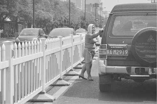 昨日下午三點左右,當記者一行開車由北關行駛到北大街十字至西華門十字的時候,突然看到前方有一位大約四十歲左右的婦女穿行在車流中,對每一位路過此處路段的車輛進行“收費”,只見她熟練地敲每一輛車駕駛座旁邊的車窗,然后向司機索取費用,而司機們大都無奈地或多或少地向她付費。