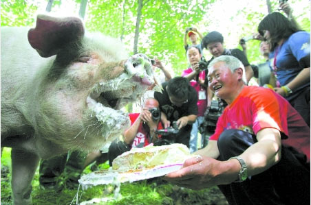 豬堅強(qiáng)在重生兩周年慶典上瘋狂啃生日蛋糕(圖)(