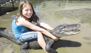 揚子晚報消息 據英美媒體20日報道,大多數9歲女童都更愿意和“芭比娃娃”玩具一起玩耍,然而,美國科羅拉多州莫斯卡市9歲女童薩曼莎·揚平時卻更喜歡和一群2.4米長的“自然界殺手”——短吻鱷們一起廝混和玩耍。原來,薩曼莎從小就生活在一個鱷魚農場中,她從6歲起就開始學會了如何和鱷魚摔跤,并將它們制服。那些200多公斤重的兇猛鱷魚在薩曼莎身邊就如同是溫馴的“寵物”,9歲的薩曼莎不僅常向游客們表演赤手空拳馴服鱷魚的驚人本領,甚至連美國海軍陸戰(zhàn)隊士兵也慕名而來向她“拜師”學習如何馴服鱷魚的“致命藝術”!