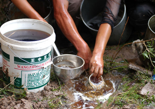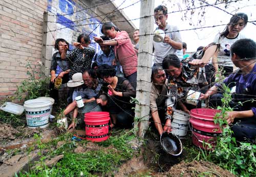 記者發(fā)現(xiàn),在現(xiàn)場搶油的村民年紀(jì)大的已經(jīng)白發(fā)蒼蒼,年紀(jì)小的還穿著開襠褲。搶油的都是以家庭為單位,一家人相互配合,分工明確,有人用各種容器從排水渠里盛油,有人則將搶到的柴油倒進(jìn)桶里,還有人用扁擔(dān)將搶到的一桶又一桶的柴油挑回家中。