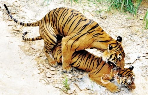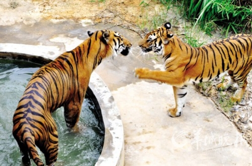 雄華南虎求愛遭雌虎打耳光 堅持不限終如愿(圖)