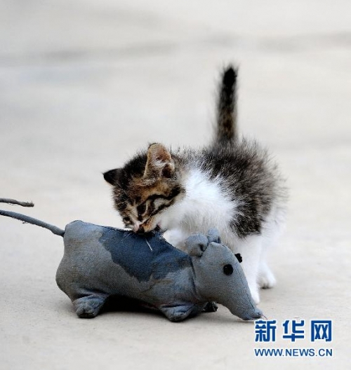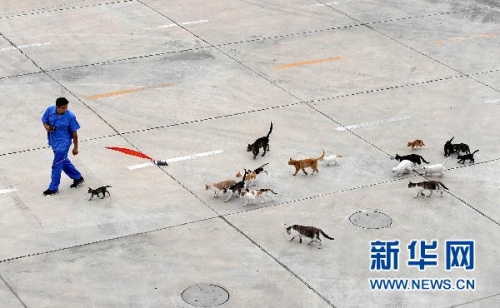 新華社消息 7月19日,劉建國用一只假老鼠在訓練小貓捕食老鼠。劉建國供職于遼寧盤錦鼎翔米業有限公司,他既不負責卸貨也不負責入庫盤點,但他卻處處受到敬重,因為他負責的是一項極為重要的工作——訓貓。鼎翔米業糧庫里存放的都是盤錦有機大米,化學合成鼠藥可能對大米的品質有影響,于是公司開始利用家貓滅鼠。劉建國訓練的“貓咪護衛隊”共有大小貓近100只。幾年來,在劉建國的調教下,這些貓已經被訓練成偵察貓、潛伏貓、巡邏貓,老劉也因此被大家稱作“貓司令”。貓具有很強的獨立性,生性警覺,在人員多、車輛多、機器設備噪聲較大的糧庫內練習成年貓難度極大,于是劉建國從小貓開始訓練。他整天與小貓為伴,和貓在一起玩耍,訓練它們抓老鼠。貓臟了,他給它們洗澡;貓生病了,他給它們打針;日久生情,小貓對劉建國非常親近,甚至一聽到劉建國的口哨聲,便撒歡兒地奔向他。公司為了讓老劉更好地管理這群貓,特意為貓咪們蓋了“貓兵營”,并分成了“一連”、“二連”和“三連”。老劉說,現在糧庫里幾乎看不到老鼠了。