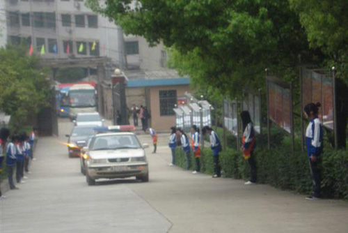 7月20日,網友“與時盡現”在“貓撲貼貼”貼出一組照片《領導到學校來視察工作,集體向遺體告別》。照片顯示,兩隊女學生,身穿藍白色相間的校服,身披紅色綬帶,列隊道路兩邊,當一列由警車開路,由小轎車和中巴車組成的車隊經過時,女生們還彎腰鞠躬。