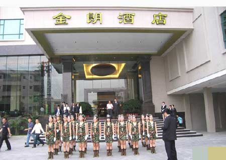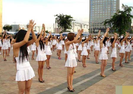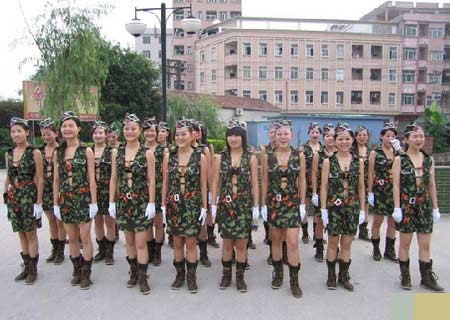 這組酒店從業(yè)人員身著迷彩裝和護士裝在酒店門口軍訓(xùn)的照片在網(wǎng)上熱傳后,有不少網(wǎng)友稱其為“東莞妹大閱兵”,調(diào)侃桑拿業(yè)競爭激烈。