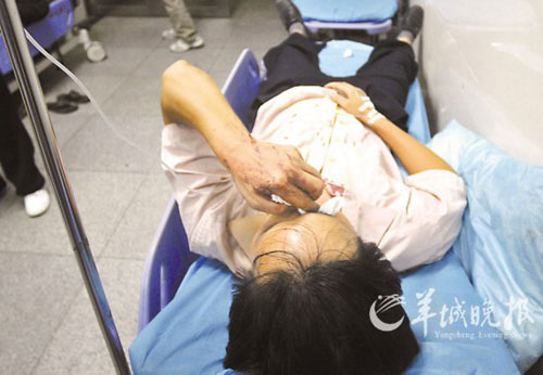 昨天中午,記者在南方醫院急診科看到了阿杰。他躺在病床上打著點滴,脖子處貼著紗布,襯衫上滿是血跡(如圖)。“傷口有六七厘米長,醫生說如果再割深一點就到氣管,生命就危險了……”阿杰的妻子悲憤地告訴記者,阿杰目前還不能說話,需要住院觀察。