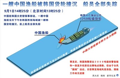 韓國海洋警察廳通報,昨日14時25分(北京時間13時25分),該中國漁船在韓國泰安西格列飛島以西68海里、韓國專屬經濟水域外側17海里處,被韓國HC海運公司一艘1250噸級貨輪撞沉,漁船上的船員全部落水失蹤。據通報,韓國海警已派出警備艇和一架直升機在出事地點進行搜救。