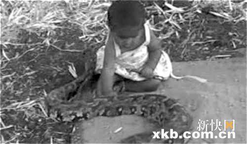 新快報訊 據《太陽報》7日報道,因為沒錢給孩子買玩具,印度一對夫婦竟然找來一條蟒蛇給才滿6個月的女兒(見圖)玩,而且無人看護。