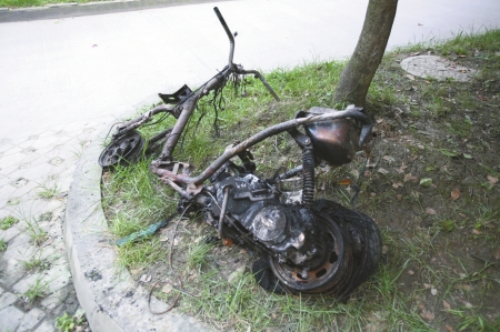 昨日中午,記者來到該小區13棟,3單元過道處還能看到明顯的過火痕跡,1到3樓墻壁都被熏黑了,靠得最近底樓的屋門,防盜門有些輕微變形。那輛被燒成光架的摩托車丟在樓前地上。從框架看,應該是一輛女式踏板摩托車。