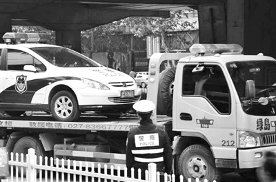 記者從現場照片中看到,一輛印有“綠島救援”字樣的拖車在交警的指揮下,拖走了一輛牌號為“鄂K0571警”的警車(見圖)。