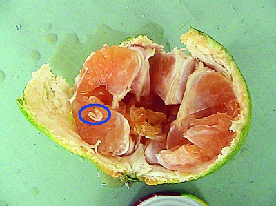 揚子晚報訊 10月11日晚,興化市民徐先生在當地樂天瑪特超市買回三斤柑橘,食用其中一個時感覺異常,吐出后發現兩條蛆蟲,掰開橘瓣還驚訝地看到,一條蛆蟲嵌在果肉中間還在蠕動,不久徐先生便感覺肚子痛。昨天下午,該超市的“問題橘”已經全部下架,目前興化市有關部門已對該批次柑橘的產地、銷售對象等情況展開調查。