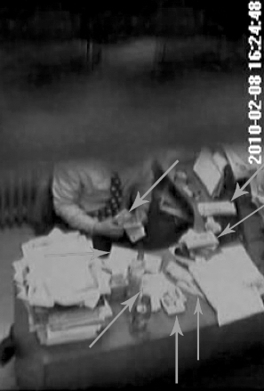 除去文字材料外,舉報人還寄來了一張光盤,其中包含8段視頻。根據文字說明,所有視頻都拍自陳某的辦公室。在名為《拿錢4》的視頻中,右上角顯示時間為2010年2月11日13時42分,畫面中一名女子在辦公室內直接拿出一疊百元現金給醫生,醫生拿著錢和女子一直在說話。