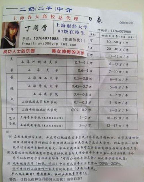 《最近2萬元就能包養上海美女大學生》的帖子在網絡上頗為流行,該帖子曝光了上海各大學的校花被包養的身價表,最便宜的竟然只要2萬元一年。