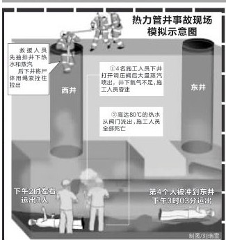 慘劇為何會(huì)發(fā)生?據(jù)救援人員初步推測(cè),4名施工人員下井打開調(diào)壓閥門后,有大量蒸汽噴了出來,導(dǎo)致井下的氧氣不足,下井人員產(chǎn)生昏迷,同時(shí)溫度高達(dá)80℃的熱水從沒有關(guān)閉的閥門處流出,將下井人員淹在滾熱的水里。