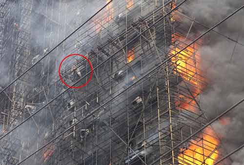 15時45分,現場目擊者稱,由于火勢進一步擴大,煙霧更加濃重,目前僅與失火大廈一條馬路之隔的樓上已經無法看到受困與樓頂的求救者。