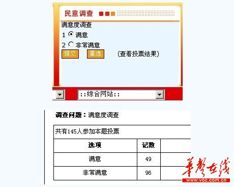 記者點擊“非常滿意”投票,一個顯示調查結果的網頁隨即彈出。記者注意到,該項民意調查自2008年10月10日下午2點開始計票,至今已有2年多時間,而投票者卻寥寥無幾,僅有百余人參加。