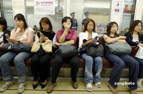 資料圖:鑒于晚上等地鐵時常發生針對女性的性騷擾或性犯罪案件,日本東京2003年在地鐵線路上開通了男士免進的女性專用列車,同類長途汽車也將開設女士專車,以保證女性夜間出行安全。