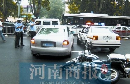 在現場,張森看到,一輛奧迪轎車正頭朝南頂在馬路中間的護欄上,兩個后車輪都已沒氣,該車的西邊停著一輛警車,“我一看就把警用摩托車停在奧迪的車后。金水路北半幅是由東向西行駛,當時造成了車輛擁堵。”