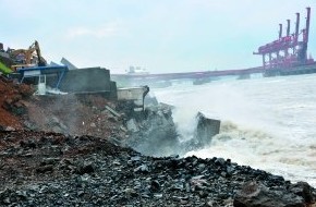 防波堤垮塌現場(8月8日攝)。目前海水暫時被控制住。新華社記者 閆平 攝
