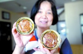 “傳說”中的三個“古董”月餅安靜地躺在盒子里,記者從中取出一個,只見月餅的塑料透明包裝上面寫著“魚翅冬蓉”,月餅皮金黃依舊,在陽光下油亮發光;皮兒上精致的花紋也清晰可見。手指輕觸月餅,感覺仍然松軟,透過塑料包裝袋仔細地聞聞,也沒有任何異味。