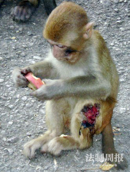 被狼狗追咬,也是獼猴們遭遇的災禍之一。知情人告知記者,2008年10月有一只獼猴被咬死;2009年5月,有兩只獼猴被咬死。“被狼狗追咬時,從母猴背上掉下來摔死的小猴,到2009年底已有10多只。”