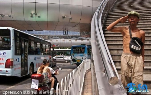 2011年9月6日,“敬禮哥”在貴陽市大十字人行天橋入口處面向過往行人畢恭畢敬的敬禮,以文明禮貌的方式向行人乞討�!熬炊Y哥”家住貴陽,今年45歲,單身一人,每天靠上萬次的敬禮乞討為生。