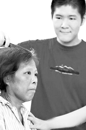 手術成功后,兒子在病房里為媽媽梳頭。