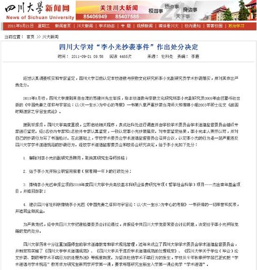 目前,學校已解除對李小光的副研究員聘用,取消其研究生導師資格;給予李小光開除公職留用察看(察看期一年)的行政處分;同時,撤銷李小光已申報立項的2010年度四川大學中央高校基本科研業(yè)務費研究專項(哲學社會科學)項目——杰出青年基金項目,并追回撥款。