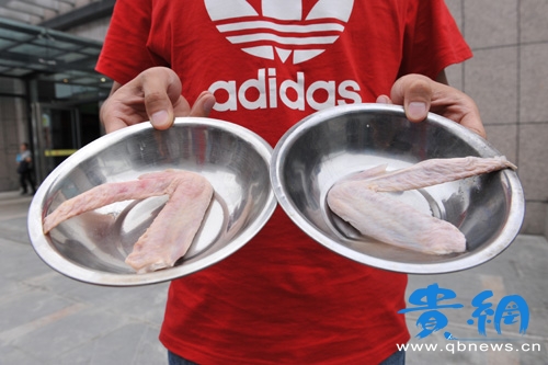 我們把亞硝酸鹽浸泡過的雞翅和新鮮雞翅分別放入油鍋,炸出來后,兩只雞翅的區(qū)別不太明顯。雖然如此,陳南滋還是給我們支了一招:用亞硝酸鹽處理過的肉有一種類似火腿的味道,而且肉的顏色會偏粉紅,口感更軟更嫩。