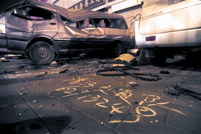 昨日凌晨,薊門橋西北角,沖出馬路的事故轎車壓在一輛轎車上面。本報記者 浦峰 攝