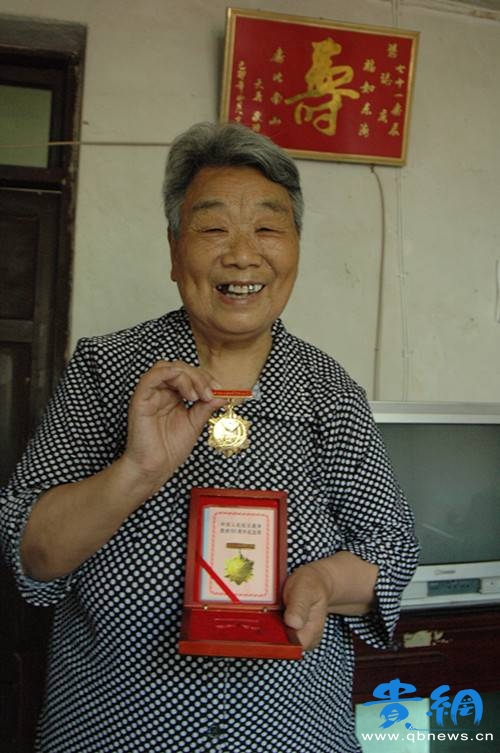 老人展示中共中央、國務院、中央軍委專門頒發給參加抗日戰爭老干部的“中國人民抗日戰爭勝利60周年紀念章”。