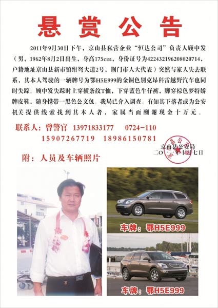 (湖北)京山縣私營企業(yè)京山恒達事業(yè)有限公司法人代表顧中發(fā)已經與家人失去聯(lián)系多日。家屬通過警方向社會懸賞10萬征集線索。