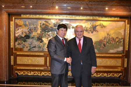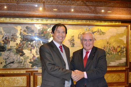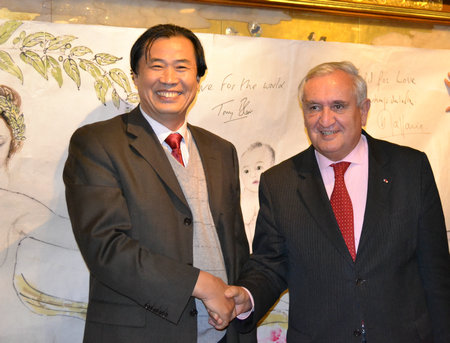 法國參議院副議長,政府前總理拉法蘭(右)與著名畫家薛林興握手留念