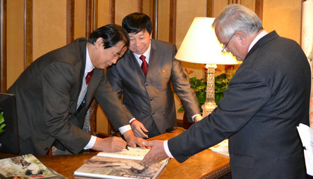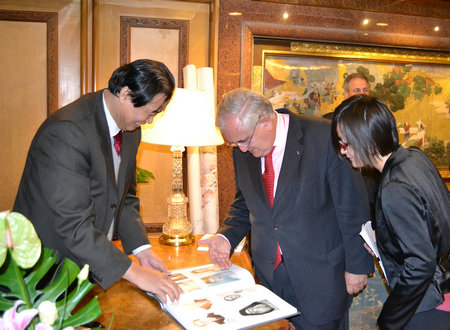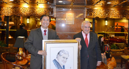 著名畫家薛林興(左)在畫冊上為拉法蘭前總理(右)簽字