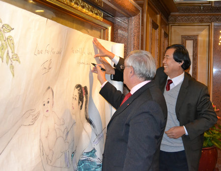著名畫家薛林興表示,他將通過《和平天使》這幅作品來弘揚社會和諧,表達全世界人們熱愛和平的共同愿望。畫作完成后,將在中國內地部分大中城市以及港澳臺和世界多個國家和地區巡回展出,期間還將邀請多個國家和地區的領導人在《和平天使》巨幅作品上題寫和平祝詞。拉法蘭總理預祝薛林興《和平天使》早日創作完成。最后,拉法蘭總理又讓隨行人員拿上了他去年剛剛出版的《中國的啟示》一書,非常禮貌地現場為薛林興先生和筆者簽名留念。拉法蘭還翻閱了著名畫家薛林興為其贈送的個人畫集,并對薛林興先生早期為時任中國國家主席江澤民、聯合國秘書長安南、美國總統布什、英國首相布萊爾等創作的寫意畫像,給予了充分肯定和高度贊揚。