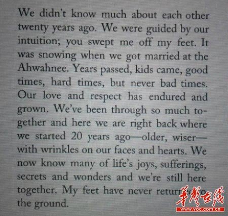 @某文化讀書 : 20年前我們相知不多。我們跟著感覺走,你讓我著迷得飛上了天。當我們在阿瓦尼舉行婚禮時天在下雪。很多年過去了,有了孩子們,有美好的時候,有艱難的時候,但從沒有過糟糕的時候。我們現在了解了很多生活的歡樂、痛苦、秘密和奇跡,我們依然在一起。我們的雙腳從未落回地面。