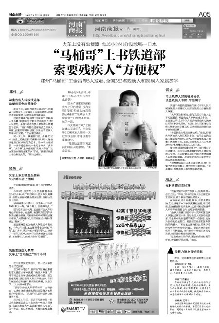 8月12日,河南商報《“馬桶哥”上書鐵道部索要殘疾人“方便權”》一文報道了此事。今年全國兩會上,謝木蘭等10多位全國人大代表共同提交給鐵道部《關于對全國殘疾人半價收取火車票票價的建議》,以減少殘疾人的經濟負擔,提高殘疾人的生活水平。