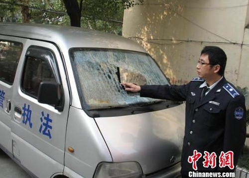 圖為擋風(fēng)玻璃被打碎的執(zhí)法車輛。